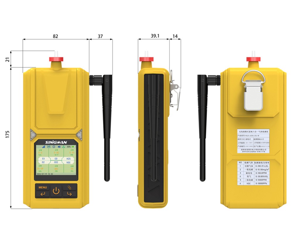 SGA-606系列便攜式六合一硫氫乙烷氣體檢測儀小巧輕便,功能強(qiáng)大。2.4英寸高清液晶彩屏,實(shí)時(shí)顯示檢測目標(biāo)氣體濃度值;內(nèi)置高性能采樣泵,1-10檔流速可調(diào);5000mA超大容量鋰電池,可連續(xù)工作20小時(shí)以上;內(nèi)置全生命周期監(jiān)控系統(tǒng),傳感器壽命到期、儀表故障、校準(zhǔn)提醒,零點(diǎn)自動修正等一應(yīng)俱全,還可一鍵復(fù)位恢復(fù)出廠設(shè)置;中文簡體、英文、中文繁體三種語言系統(tǒng),適合所有人群操作。umol/mol、ppm、ppb、%LEL、%VOL、mg/m3、ug/m3、g/m3、mg/l、g/l等濃度單位之間自由切換,氣體濃度值一目了然;支持本地存儲10萬條以上數(shù)據(jù),自動存儲歷史記錄、報(bào)警記錄、故障記錄、開關(guān)機(jī)時(shí)間等數(shù)據(jù),數(shù)據(jù)存儲間隔時(shí)間1-999秒可調(diào);支持PC-TWA時(shí)間加權(quán)平均容許濃度和PC-STEL短時(shí)間接觸容許濃度:數(shù)據(jù)可通過儀器自帶的專用軟件通過USB進(jìn)行導(dǎo)出Excel表格,進(jìn)行編輯、打印、存儲等工作;標(biāo)配水阱過濾器,有效過濾粉塵顆粒物和水汽,提高檢測精度,延長傳感器使用壽命;也可選配內(nèi)置無線模塊,通過4G流量卡實(shí)時(shí)將監(jiān)測數(shù)據(jù)上傳到物聯(lián)網(wǎng)平臺;智能光感控制功能,儀表會自動根據(jù)當(dāng)前光照度調(diào)節(jié)屏幕亮度;大氣壓指標(biāo)監(jiān)測,特別適合高海拔環(huán)境下使用;標(biāo)配鱷魚夾,可在使用過程中真正解放雙手,不影響正常作業(yè);防跌倒報(bào)警功能,當(dāng)人員發(fā)生意外跌倒,檢測儀則會持續(xù)進(jìn)行報(bào)警,提醒其他工作人員及時(shí)救援;特別適合進(jìn)入隧道、管廊、地窖、污水池、下水道、礦井、密閉空間等場所的作業(yè)人員使用;