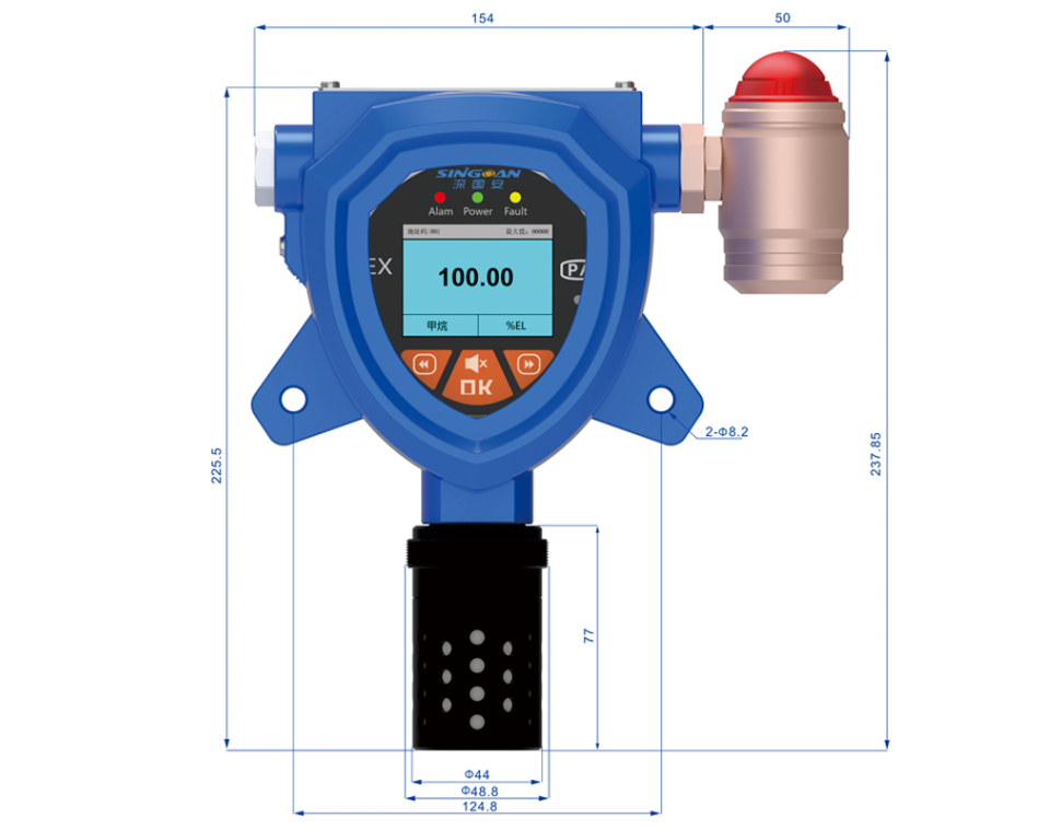 SGA-501系列在線式激光甲烷氣體檢測儀功能強大,配置齊全;2.4英寸大屏幕液晶顯示屏,可實時顯示甲烷氣體名稱、氣體單位、現場濃度值等信息;中英文、繁體操作界面,適合所有人群;工作指示燈(綠)、報警指示燈(紅)、故障指示燈(黃)、監測狀態,一目了然;32位納米級微處理器+24位超高ADC采集芯片,檢測數值更穩定;一體式聲光報警器,簡潔大方;高中低三級報警點自由設置,當現場監測氣體濃度值達到預設報警點時,會自動發出85dB以上聲光報警、提醒人員安全撤離;還可選配開關量信號,與風機、切斷閥、噴淋系統等設備進行聯動,自動處置險情;紅外遙控器,無需開蓋即可對現場氣體報警器進行調零、高中低報設置、氣體校準等服務;深國安獨有三防設計(防高濃度過載+防人員誤操作+防雷擊),安全系數可與國外原裝進口氣體檢測儀相媲美: