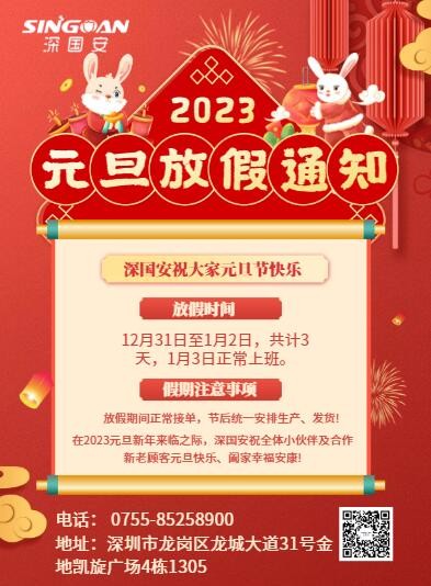 2023年元旦新年即將來臨,根據國務院辦公廳通知及我司的實際情況,現確定深國安元旦放假通知安排如下:放假時間:2022年12月31日至1月2日,共計3天,1月3日正常上班。(放假...
