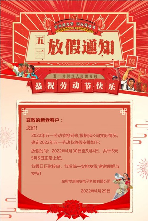 2022年五一勞動節將到來,根據我公司實際情況,現確定深國安電子2022年五一勞動節放假安排如下:放假時間:2022年4月30日(星期六)至5月4日(星期三),共計5天,5月5日(星期四)...