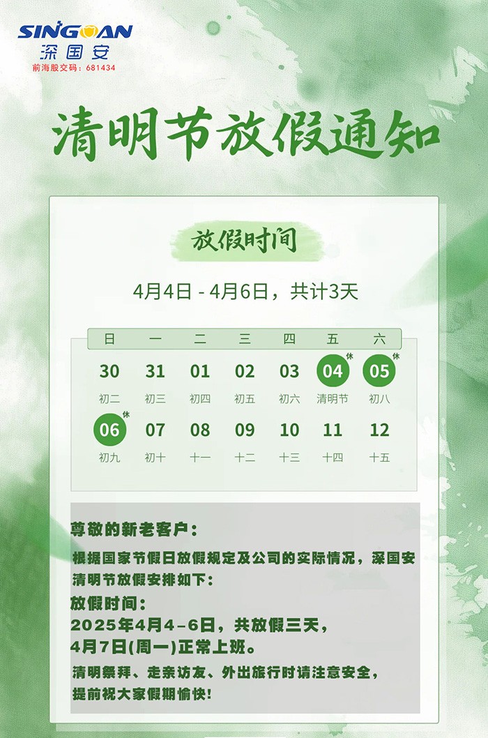 根據(jù)國家節(jié)假日放假規(guī)定及公司的實際情況,深國安電子清明節(jié)放假安排如下:放假時間:2025年4月4-6日,共放假三天,4月7日(周一)正常上班。(清明祭拜、走親訪友、外出旅行時...