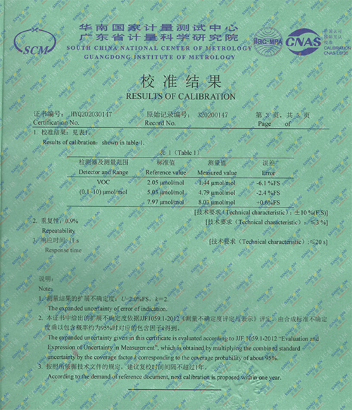 深國(guó)安電子制造的SGA-501系列固定式SF6六氟化硫氣體檢測(cè)儀,出廠帶第三方專業(yè)計(jì)量院校準(zhǔn)報(bào)告證書(shū),其校驗(yàn)報(bào)告結(jié)果:儀器精確度:3%FS ,重復(fù)性:0.3%FS,線性誤差:1% FS,響應(yīng)時(shí)間:19S;報(bào)警誤差:0.0%;不過(guò)在SF6六氟化硫氣體檢測(cè)儀采購(gòu)上,如需要出示儀器校準(zhǔn)報(bào)告,用戶也可自行送檢任何計(jì)量院進(jìn)行校驗(yàn),校準(zhǔn)標(biāo)定等檢測(cè),據(jù)說(shuō)一般送檢費(fèi)用是在一千左右,需要客戶自行承擔(dān)。