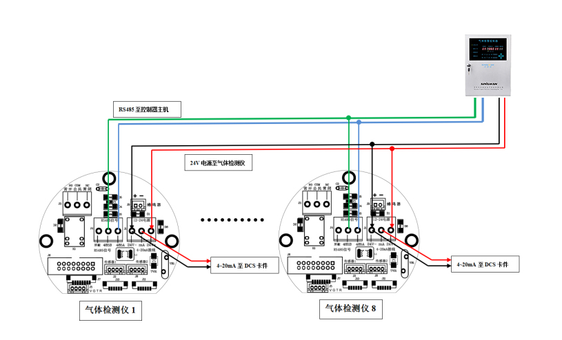 氣體檢測(cè)儀四線制多為RS485輸出信號(hào),其布線多為總線制,即手拉手串聯(lián)布線。四線制的報(bào)警器中一般有四個(gè)接線端子,分別對(duì)應(yīng)供電正負(fù)和485信號(hào)正負(fù),一般端子表示分別為VGAB,在四線制接線中,只需要將每個(gè)可燃?xì)怏w探測(cè)器的VGAB端子串聯(lián)至另外一臺(tái)報(bào)警器的VGAB端子即可。